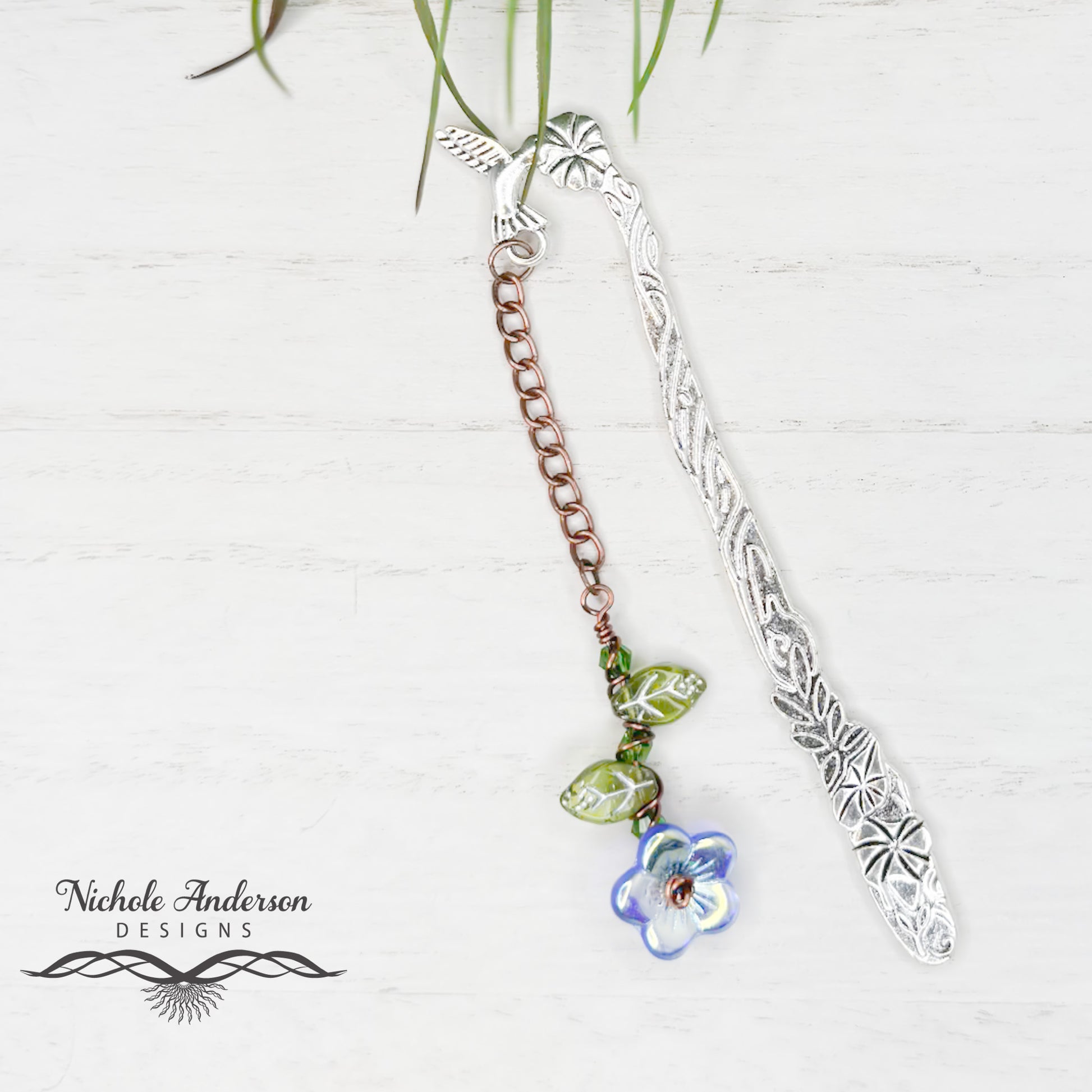 - 4.5 inch Silver Hummingbird Bookmark with 3.5 inch chained flower drop.