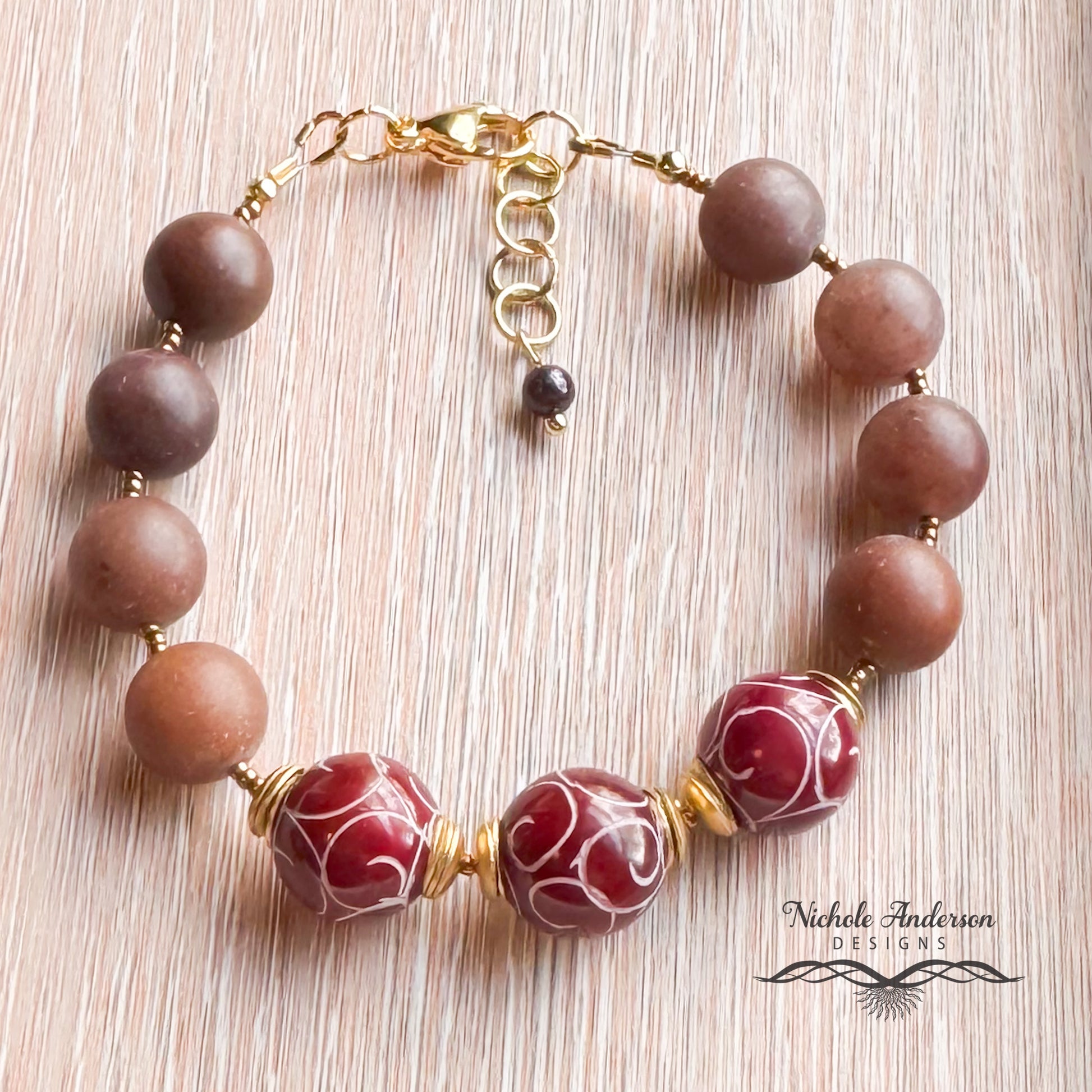 Discover timeless elegance with this exquisite bracelet showcasing carved ruby jades as the focal point. Polished brass interlocking spacers frame the centerpieces with refined detail, while light bronze beads and purple aventurine stones create visual rhythm and depth. A delicate garnet bead suspends from the attached Stainless steel gold jump rings to a Lobster Clasp securing this design. An Adjustable sizing from 6¾ to 8 inches ensures a perfect fit for any wrist. This sophisticated piece merges natural stone beauty with thoughtful design, making it an ideal choice for those seeking jewelry that tells a story and complements any occasion.