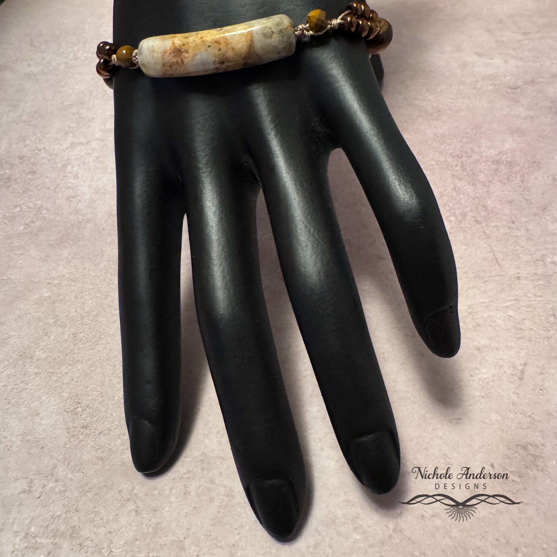 This hand-knotted bracelet features a stunning crazy lace agate bar surrounded by tiger iron cubes, tiger eye rounds, opaque luster green glass rondelles, and antique copper seed beads—all strung on tan nylon cord. Adjustable from 7" to 10½", making it a versatile unisex piece. Earthy, organic, and completely one of a kind.
