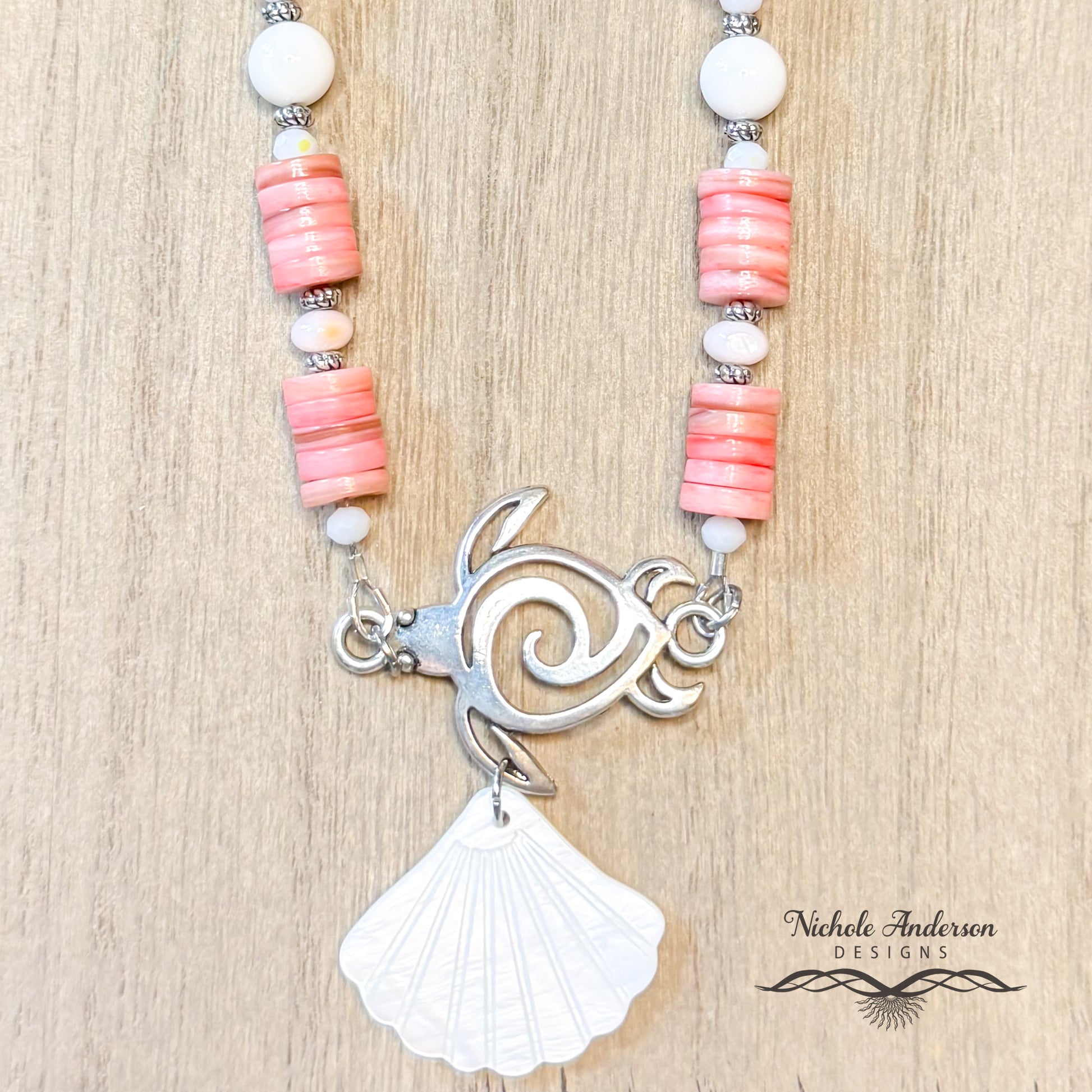 Embrace the spirit of the sea with the Hawaiian Turtle Heishi Necklace. Featuring a silver sea turtle pendant with a delicately carved shell, this necklace is strung with alabaster ab crystal rondelles, polished seashell beads, pink-dyed freshwater shell rondelles, and rose-colored heishi, accented by silver-tone spacers. Finished with a textured stainless steel chain and lobster clasp, it offers lasting durability and effortless island style. Perfect for adding a touch of coastal elegance to any outfit.