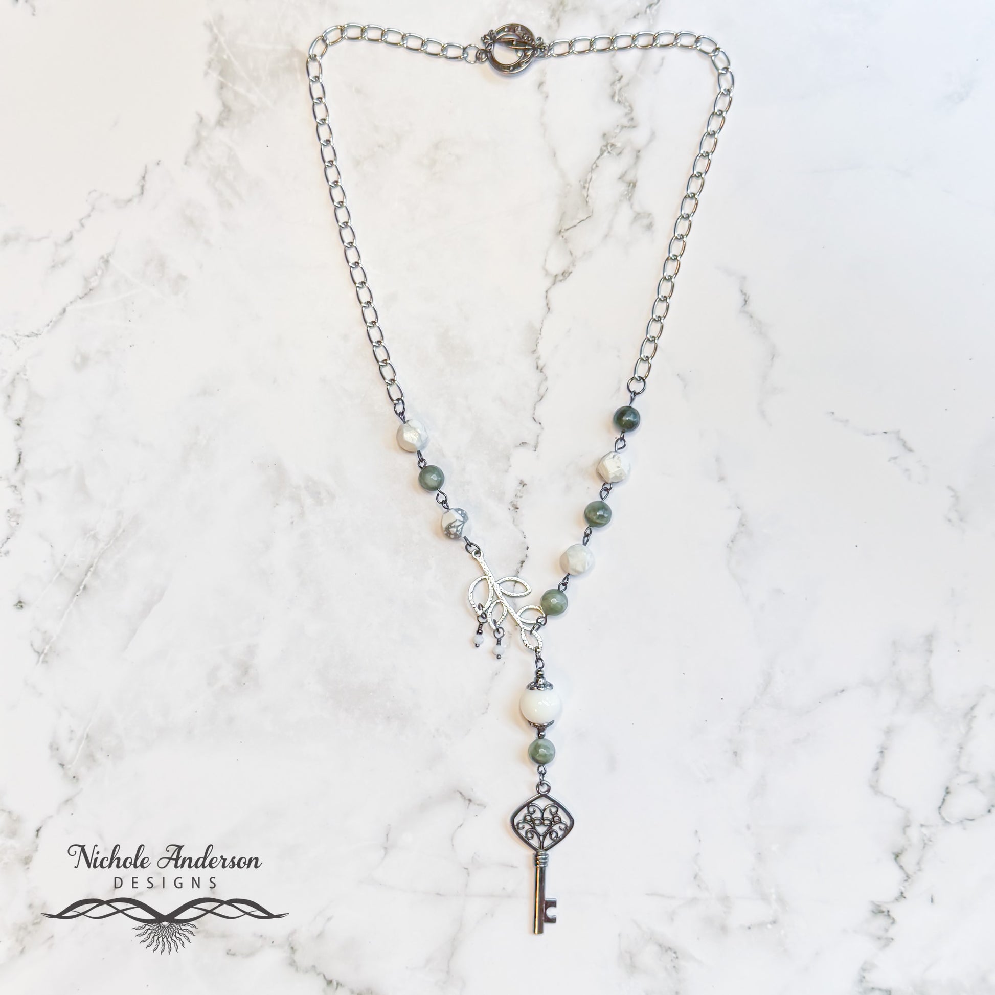 Elevate your style with this striking 20-inch necklace featuring a 3.5-inch focal pendant. The gunmetal key pendant is beautifully complemented by a Glass Round Bead and Green Line Jasper stone. Howlite english cut and Green Line Jasper stones, are all linked and attached to a silver branch leaf design. Finished with a rhodium-plated, nickel-free chain and an ornate toggle clasp, this piece offers both elegance and comfort for everyday wear. Perfect for adding a unique, nature-inspired touch to any outfit.