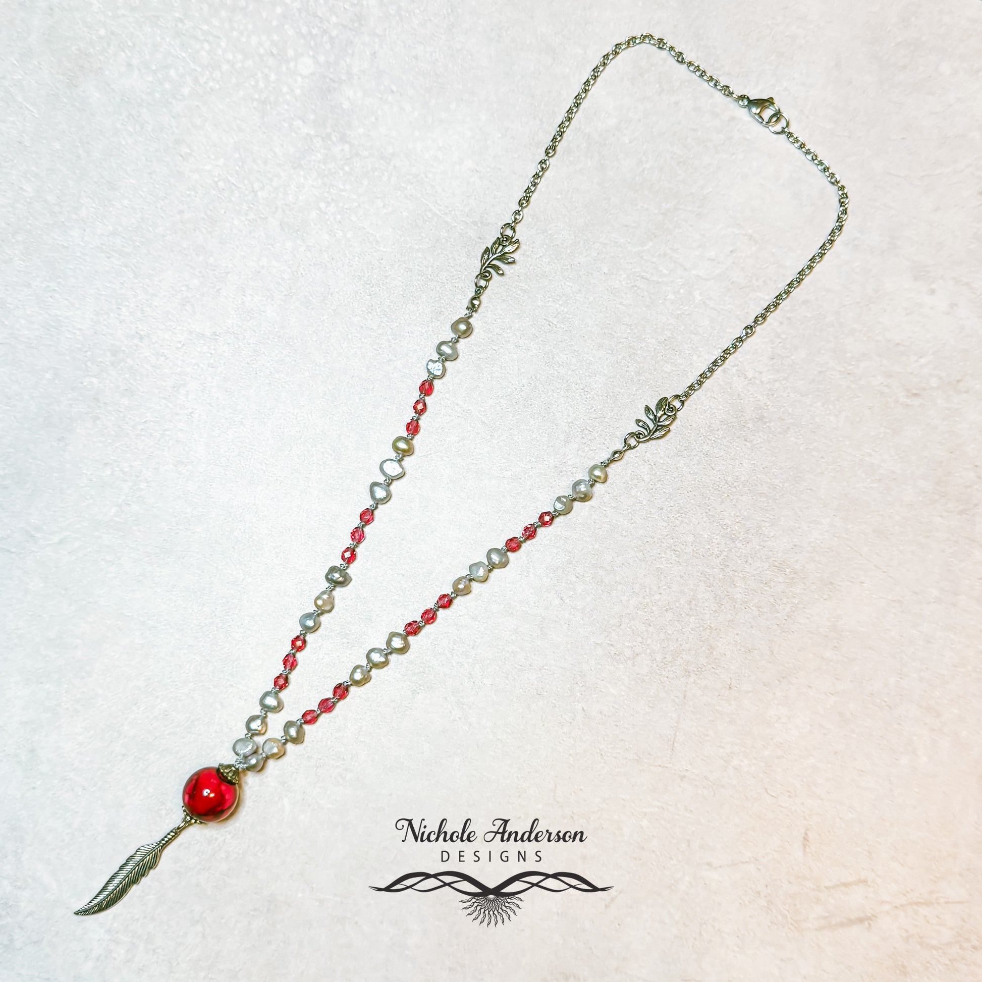 Discover timeless beauty in this artfully designed knotted necklace that captures attention with every wear. Hand-knotted grey pearls and iridescent fire-polished rose beads flow along silk cord, drawing focus to a mesmerizing dark rose glass pendant elegantly framed with silver bead caps. A silver feather adorns the striking centerpiece, while ornamental silver branches extend gracefully from the knotted design to connect with a sturdy stainless steel chain. This one-of-a-kind piece brings refined sophistication and creative flair to your jewelry wardrobe.