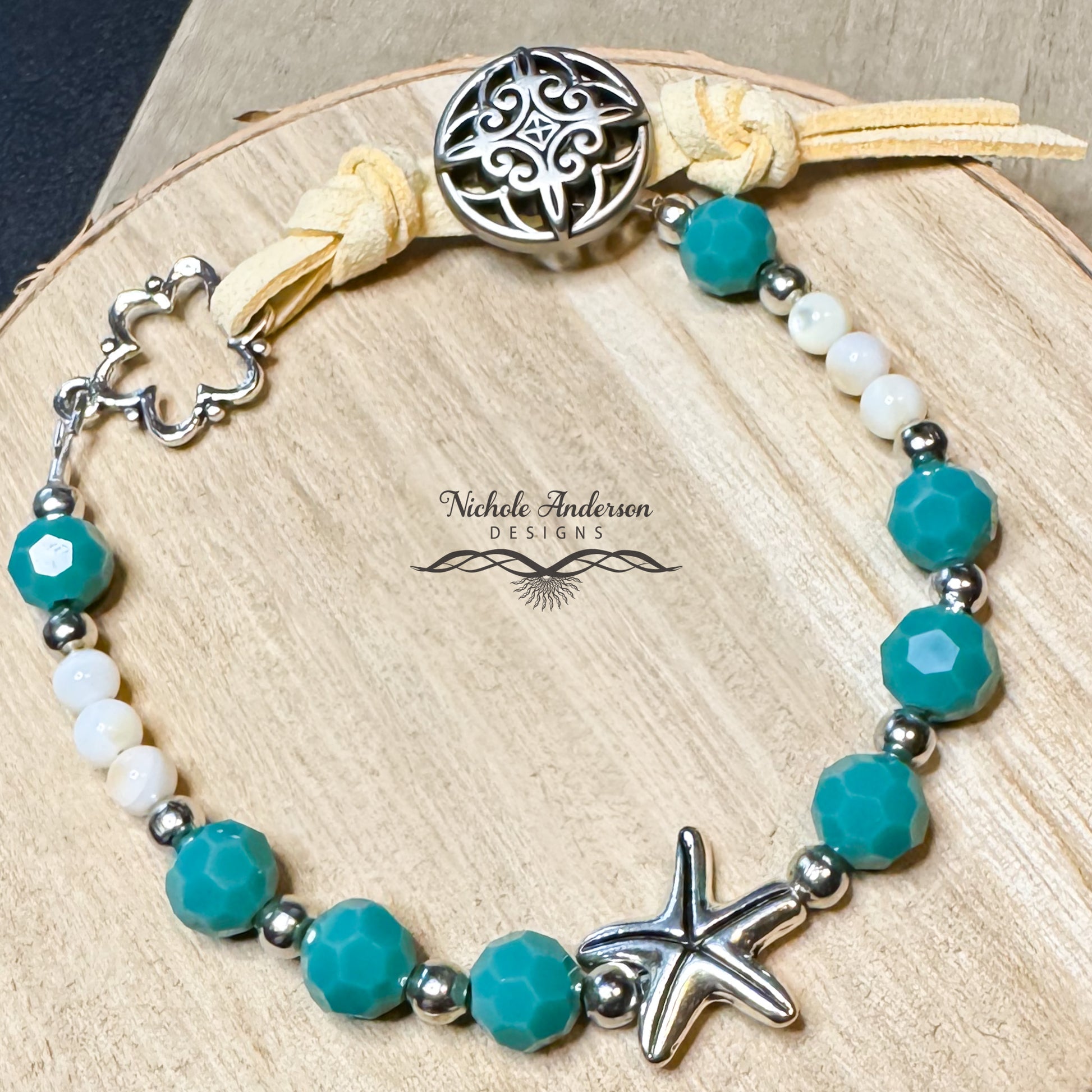 Capture the essence of the beach with the Ocean Starfish Bracelet. Featuring stainless steel rounds, vibrant turquoise colored crystal beads, and luminous mother of pearl, this piece evokes the calming colors of the ocean and sand. The striking silver star centerpiece draws attention, while the silver-finished filigree button and faux suede cord with a flower clasp provide a unique, secure fit. Perfect for those who love the sea, this bracelet blends elegant design with coastal spirit to enhance any look effortlessly.