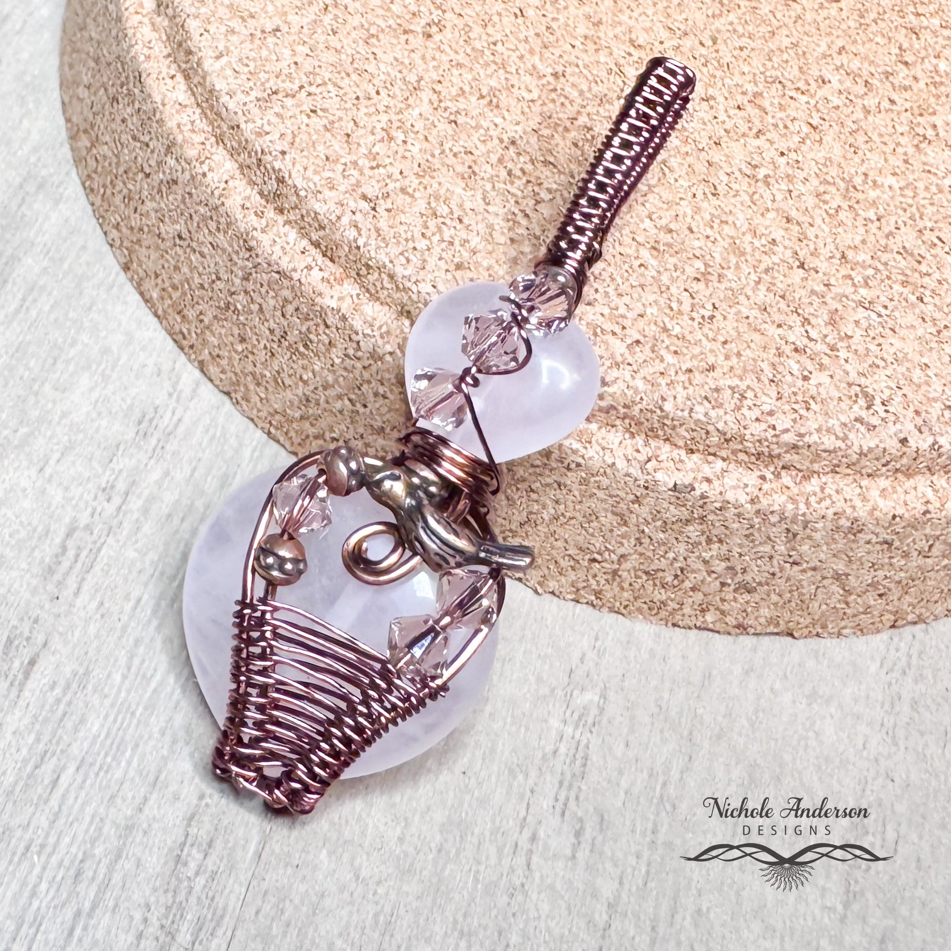 Two rose quartz hearts wrapped in antique copper wire, adorned with sparkling pink Swarovski crystals and delicate copper accents. A tiny bird charm rests gently at the center—a quiet reminder that love always finds a place to land.