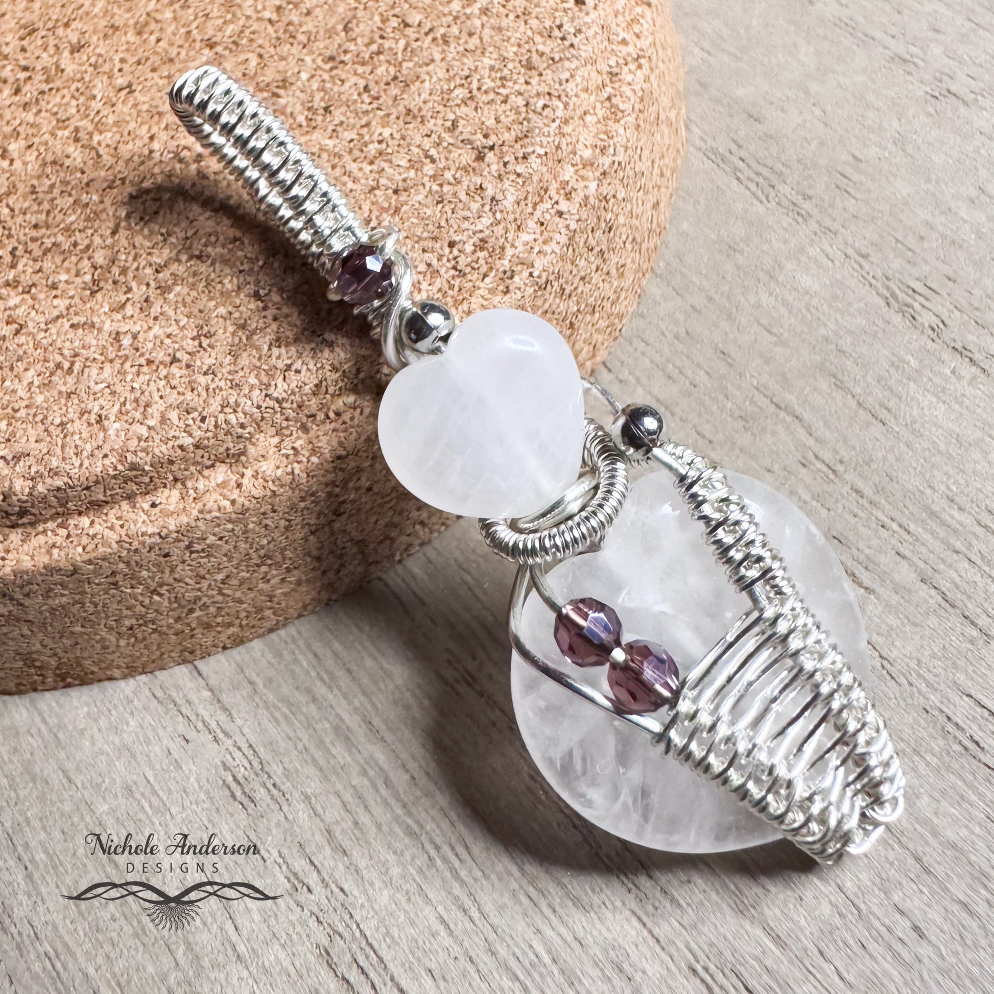 Two rose quartz hearts wrapped in silver plated wire, accented with delicate violet glass crystals that catch the light with every move. Soft, romantic, and full of quiet beauty.