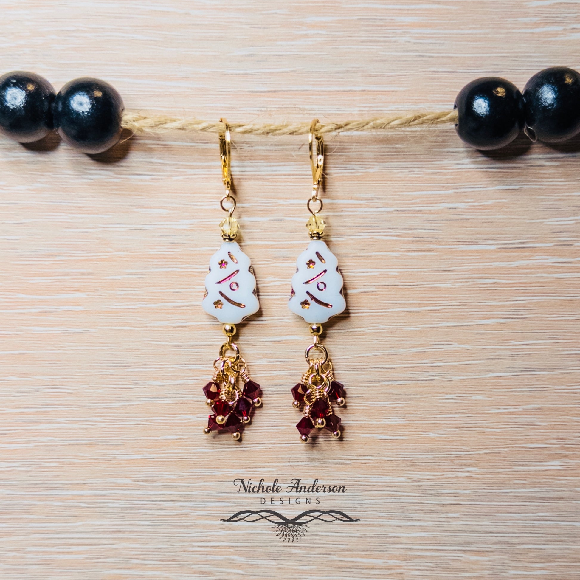 Celebrate the season with these enchanting White Christmas Cluster Earrings, where artistry meets elegance. Each piece features exquisite white Czech glass tree with a shimmering vitrail coating, crowned with a pale yellow Swarovski bicone crystal nestled in a ornate tierracast bead cap. Delicate ruby red preciosa crystals dangle gracefully below, wire-wrapped in champagne gold tone ball pins for a warm, luminous finish. Finished with hypoallergenic 24k gold-plated stainless steel leverbacks, these earrings offer comfort without compromise. Perfect for holiday celebrations or gifting to someone special, they bring festive sparkle and sophisticated charm to any occasion.
